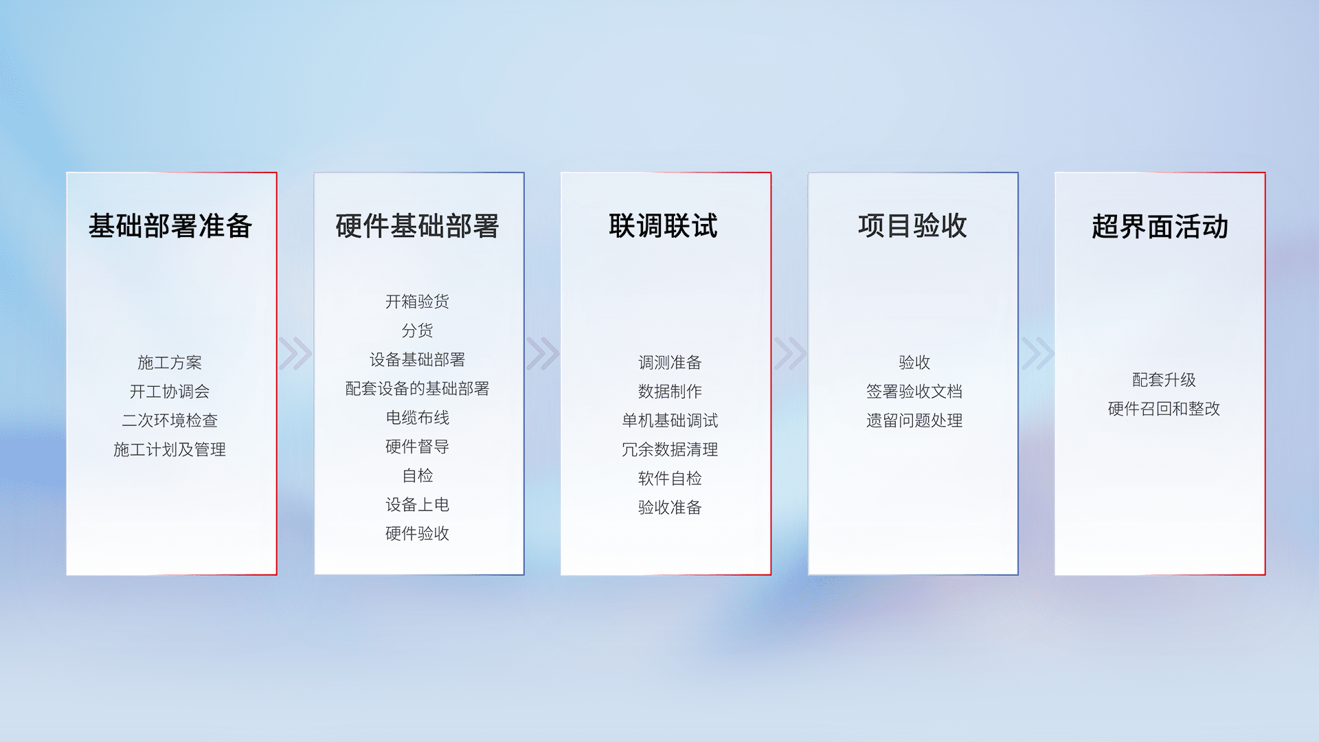 从基础部署准备、、硬件基础部署、、、、联调联试、、项目验收、、、、越界面活动的全过程可追溯,,,保证施工质量和进度。。。